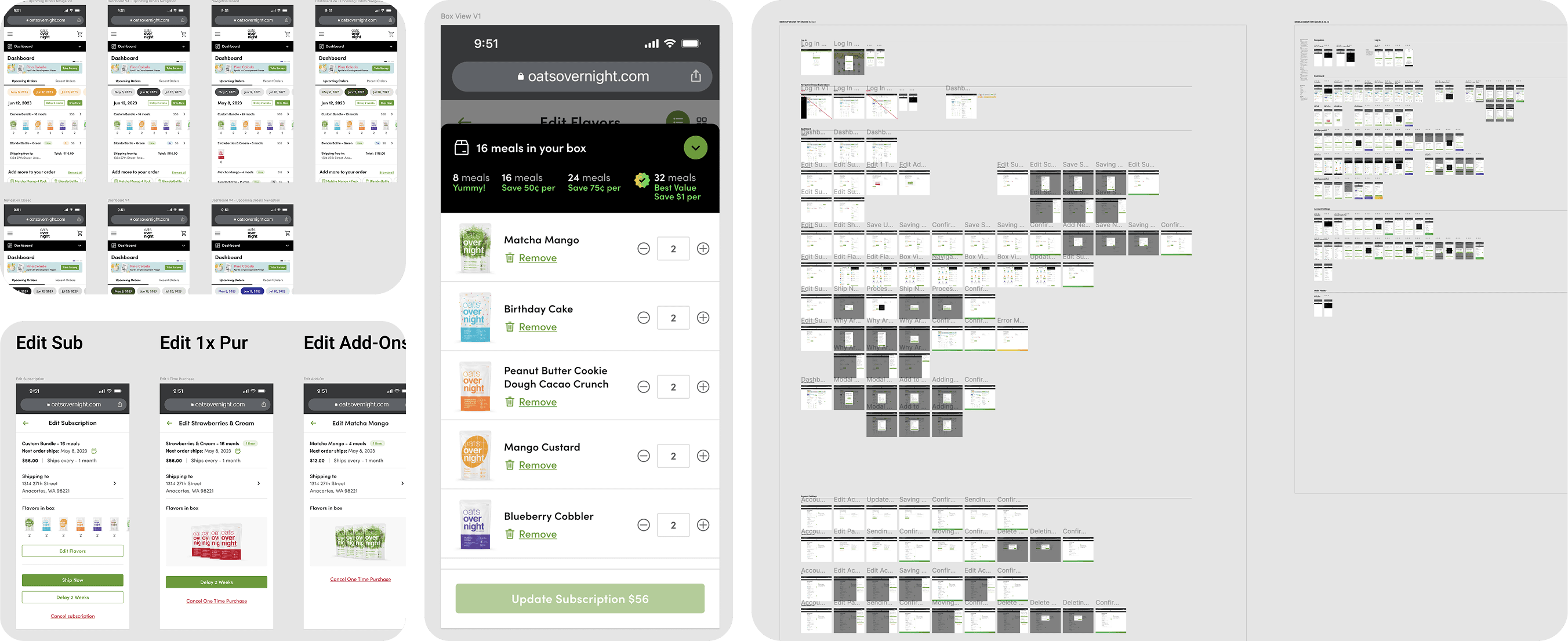 Before I joined, Oats used freelancers to start building a separate experience outside Shopify. The initial design work was extremely unorganized, did not match oats visual language or tone, and flows were just as frustrating as before but more steps. Dev team was actively building as they were getting fed piecemeal flows (see below).