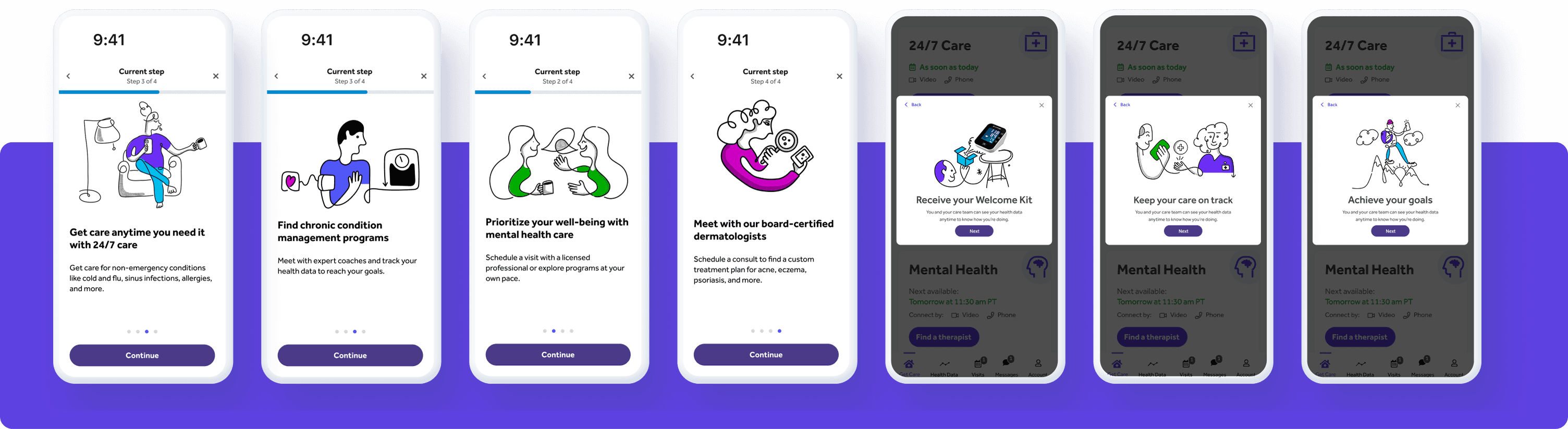 The existing product relied on generic stock art that didn’t reflect the new brand or the humanity of healthcare. I explored and built a custom illustration system that embodied Teladoc’s core principles and could flex across lighthearted and serious medical contexts.